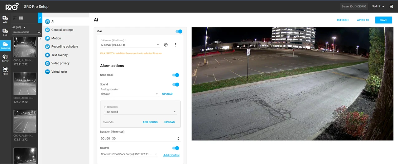 SRX-Pro is i3 International's flagship digital video management software, designed to deliver powerful video surveillance and business intelligence data, whether on-premises or through cloud-based management (CMS). With a web-based interface, SRX-Pro allows seamless setup and configuration of cameras and devices by technicians. This includes assigning camera names, linking cameras for AI functionality, and pushing critical data to the CMS for advanced analytics.